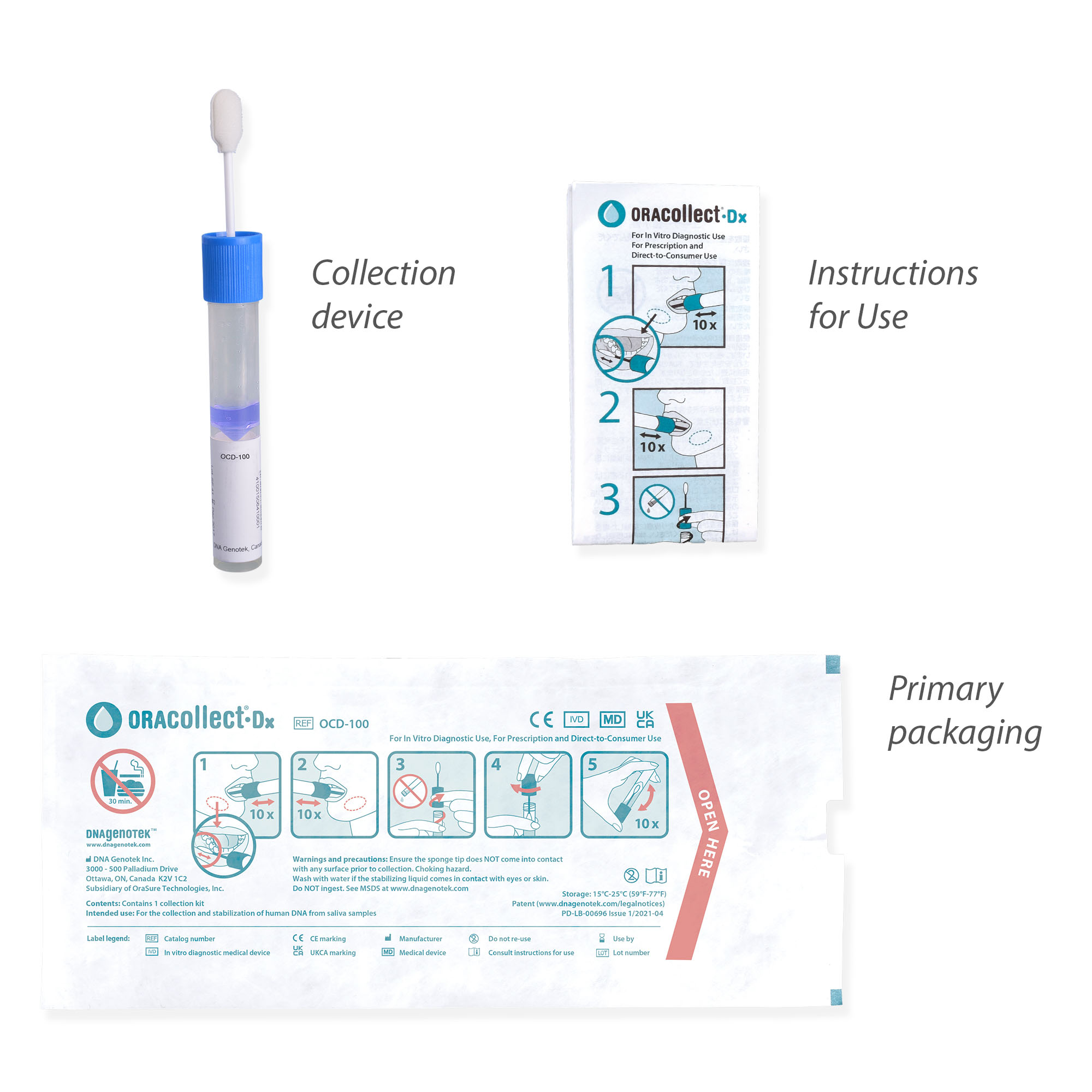 * ORAcollect®•Dx (OCD-100) is FDA-cleared for in vitro diagnostic use, for prescription use (k152464) and over-the-counter (direct-to-consumer) use (k212745). FDA cleared for in vitro diagnostic use with the eSensor® Warfarin Sensitivity Saliva Test. FDA-cleared for OTC use with the AlphaID™ At Home Genetic Health Risk service